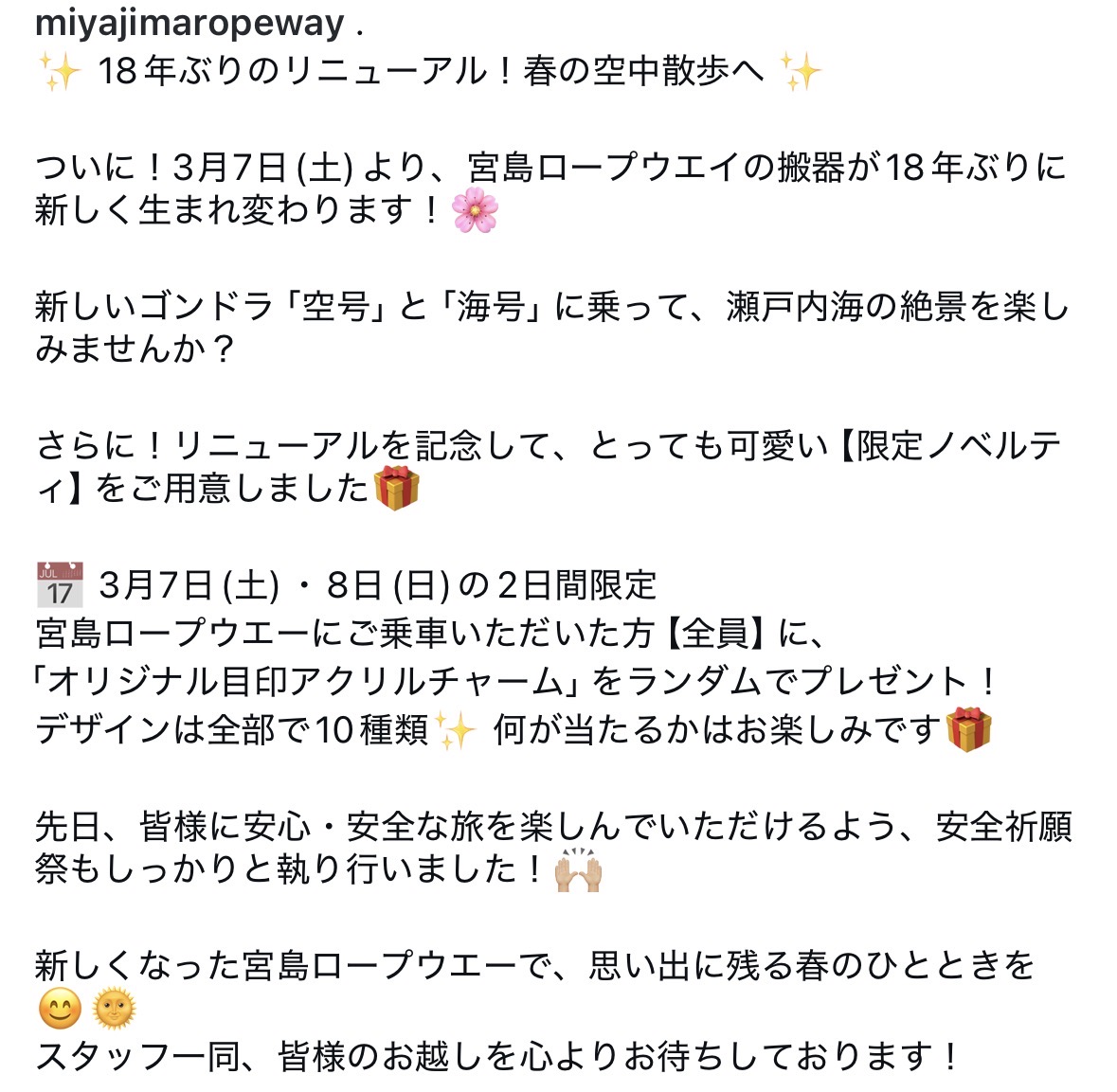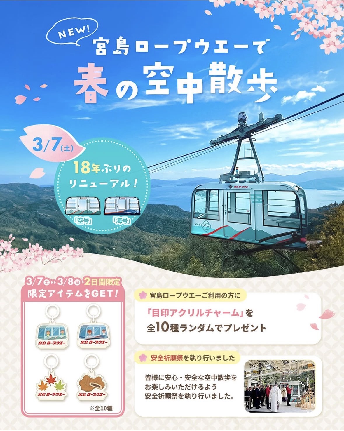 宮島ロープウエー様は明日(3月7日より)運行再開。新しい客車となります。7日8日は限定ノベルティとして、ロープウエーに乗車された方全員に「目印アクリルチャーム」をプレゼント。デザインが全10種類とのことです♪