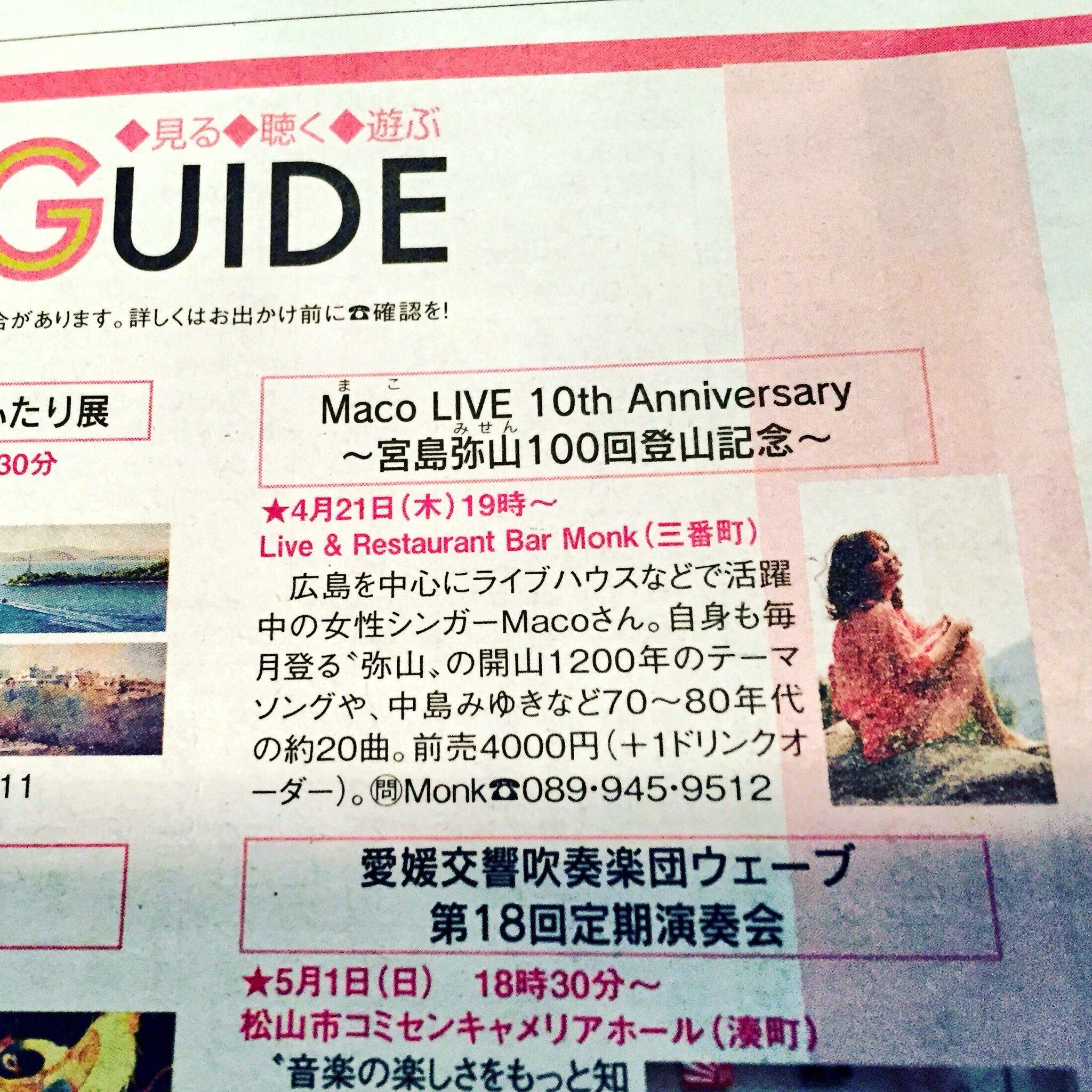 4月9日発行『 リビングまつやま 』に、4月21日(木)松山3番町 【 monk 】ライブを掲載していただきました。ありがとうございました(^^)