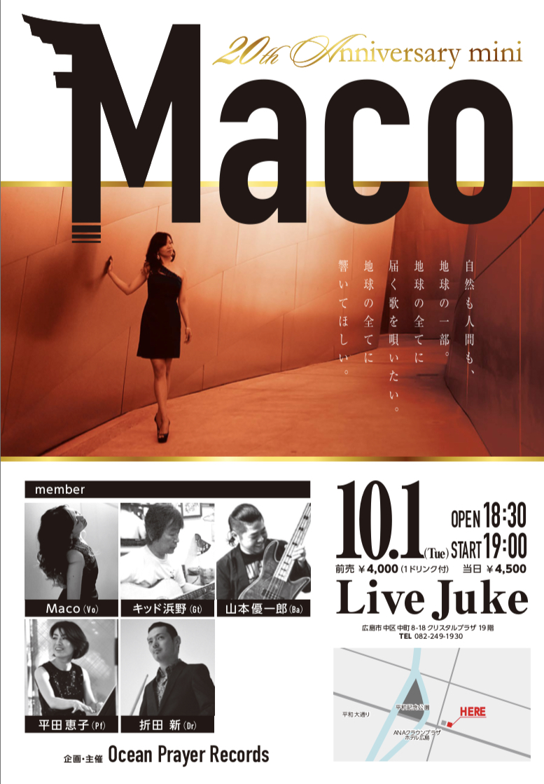 平田さんには、この数年、私が歌う曲の譜面製作を依頼させていただいている事や、私のライブを観に来てくださっている事から、Maco Liveの「音作り」により早く熟知してくださると思い、今回は出演の御願いをさせていただきました。