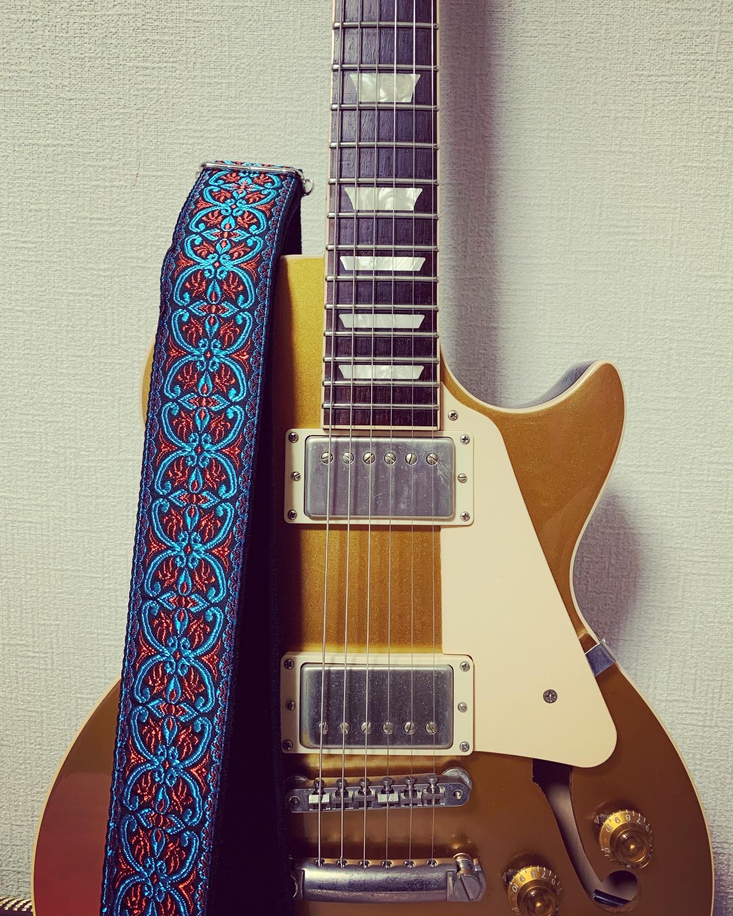 初代ギブソンはメタリックグリーンなので、緑のストラップ。