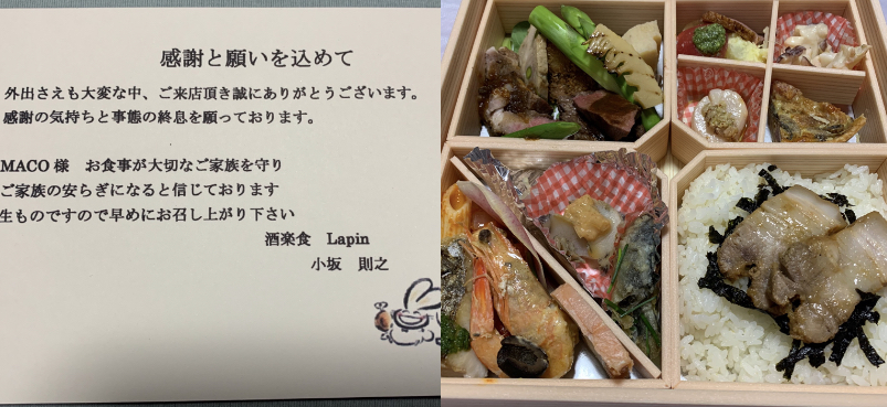 夜は、お世話になっている「酒楽食Lapin」さんのtakeout!!を、お世話になっている方から、プレゼントしていただき…