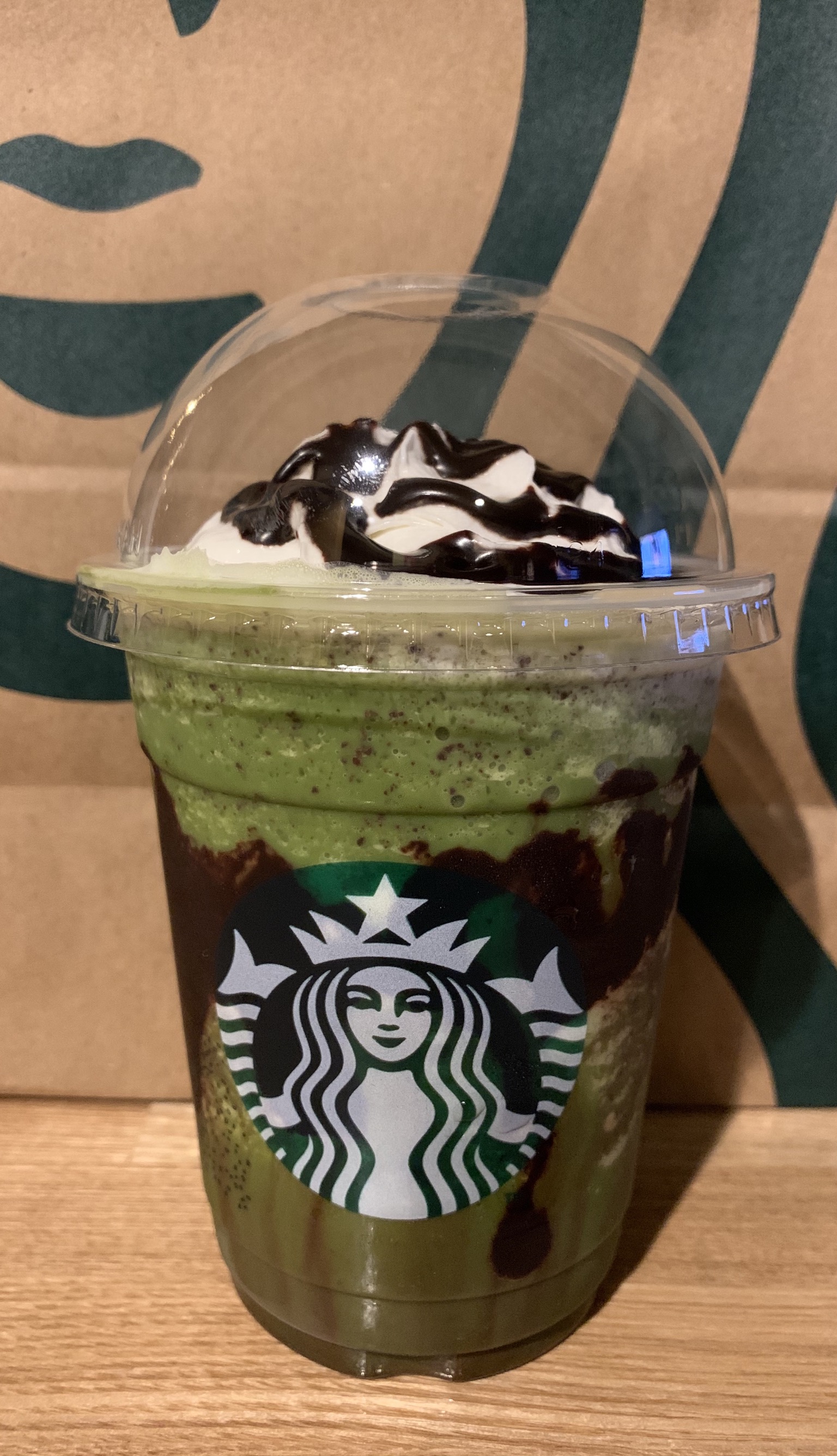 いつもの [抹茶クリームフラペチーノ]をオーダーすると、可愛い店員さんから、「当店のみのオリジナルです。」とチョコレートが追加されているものをお勧めされたので、そちらに変更(o^^o)