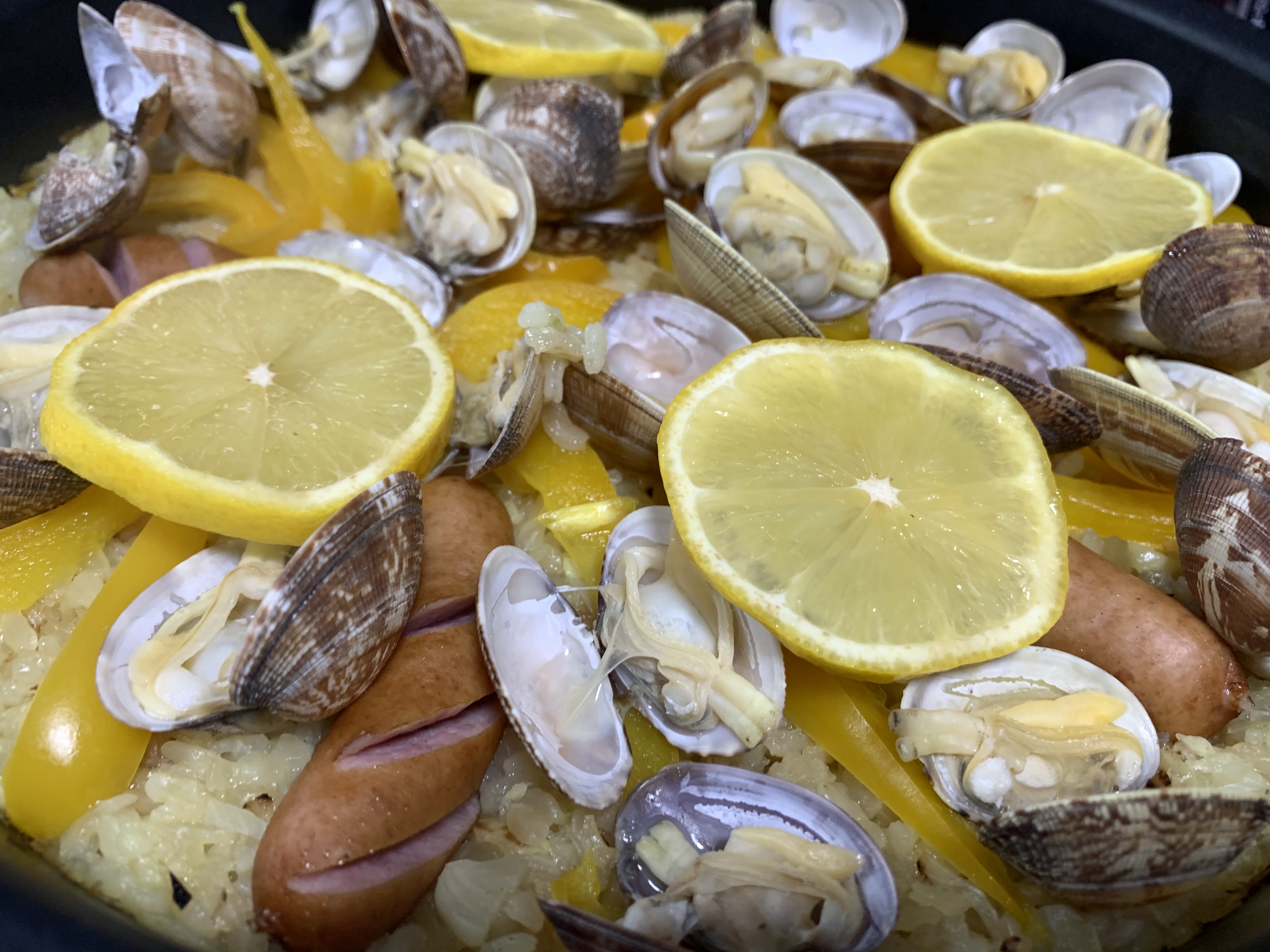 アサリとソーセージのパエリア。