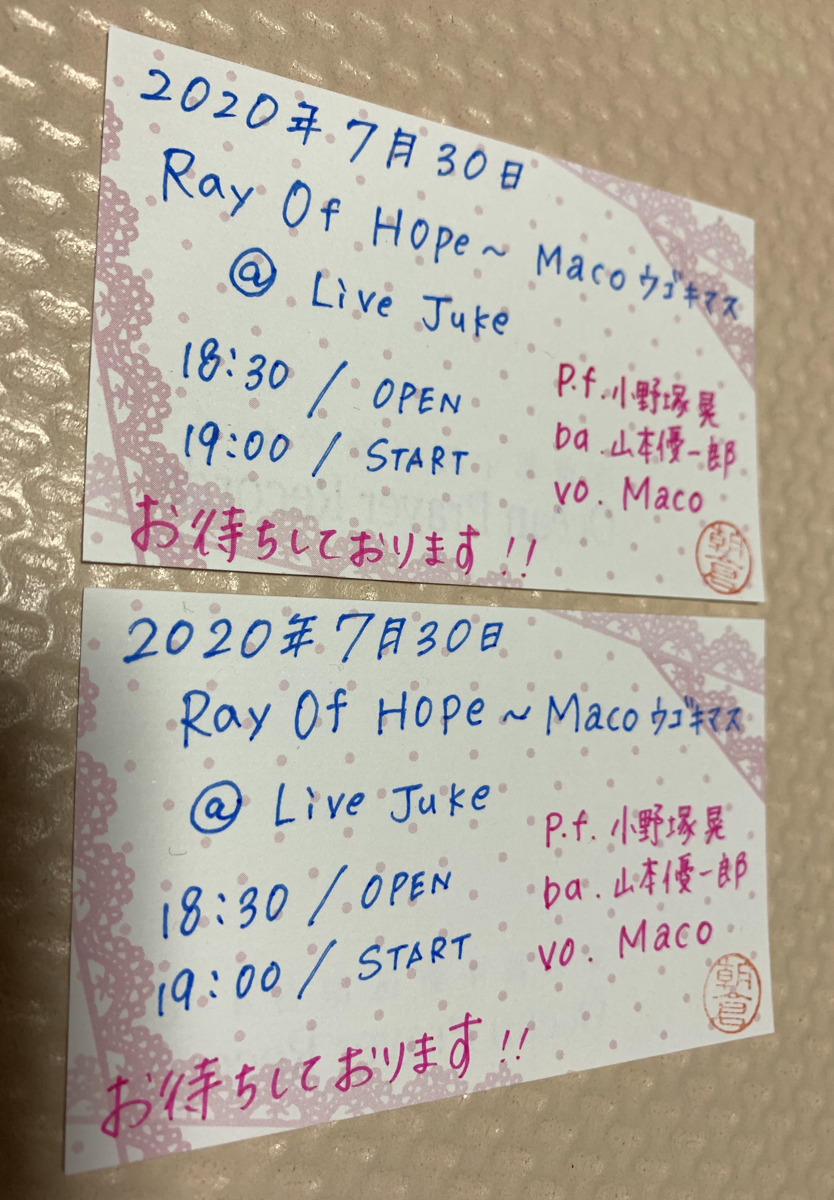 しかし、毎回、前もってチケットを購入してくれる友人へ手書きチケットを制作(o^^o)