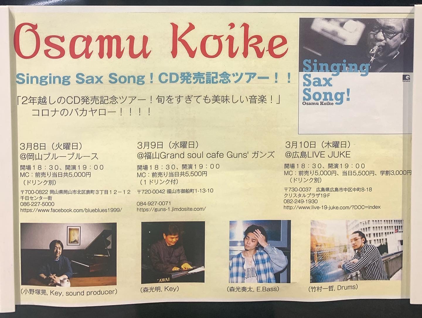 広島ご出身、日本を代表されるsax小池修氏のCD発売Liveでしたが、ミュージシャン皆様も超一流で、めちゃくちゃ感動しました。