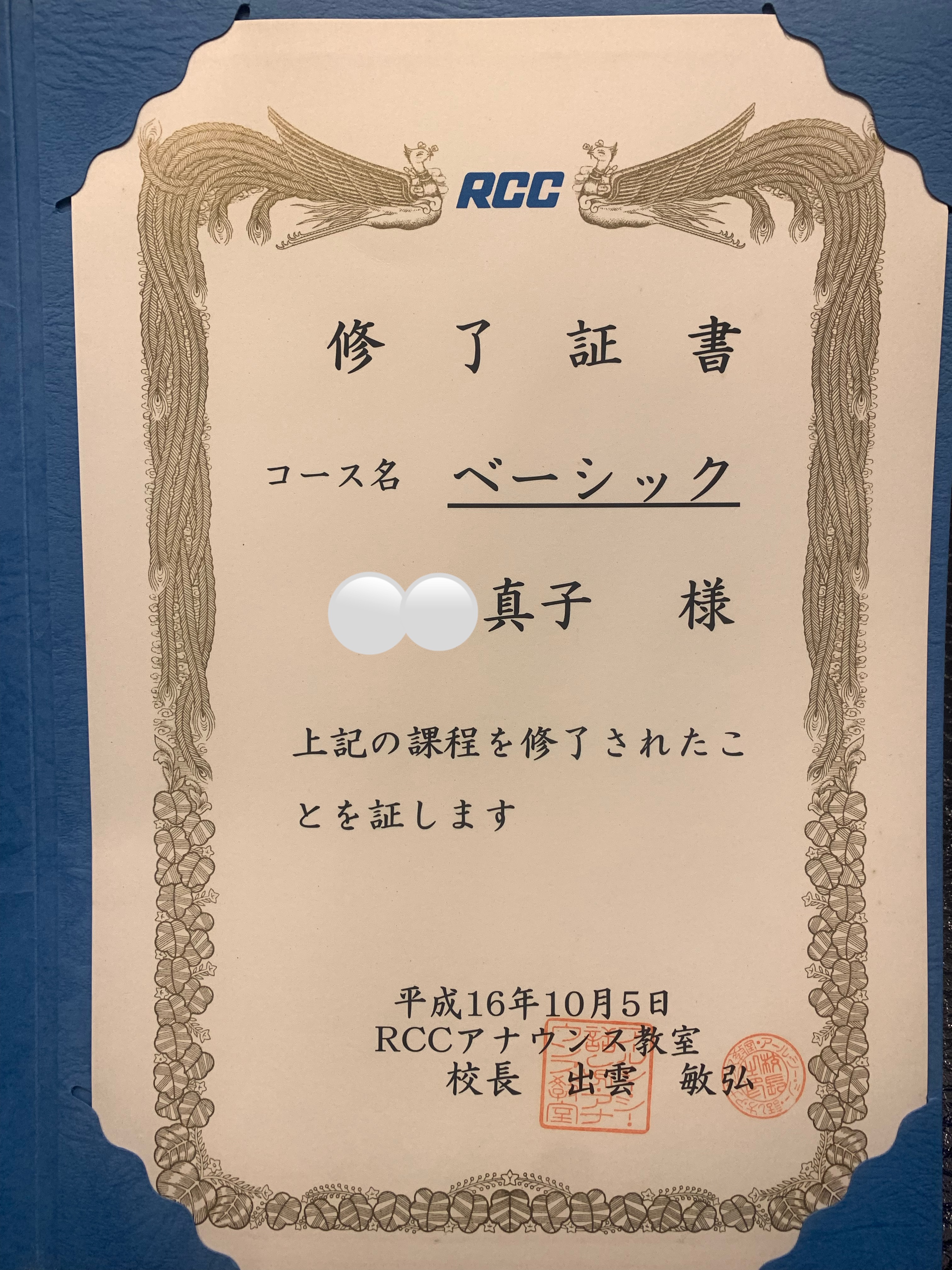 RCCのアナウス教室の修了証です(^^)