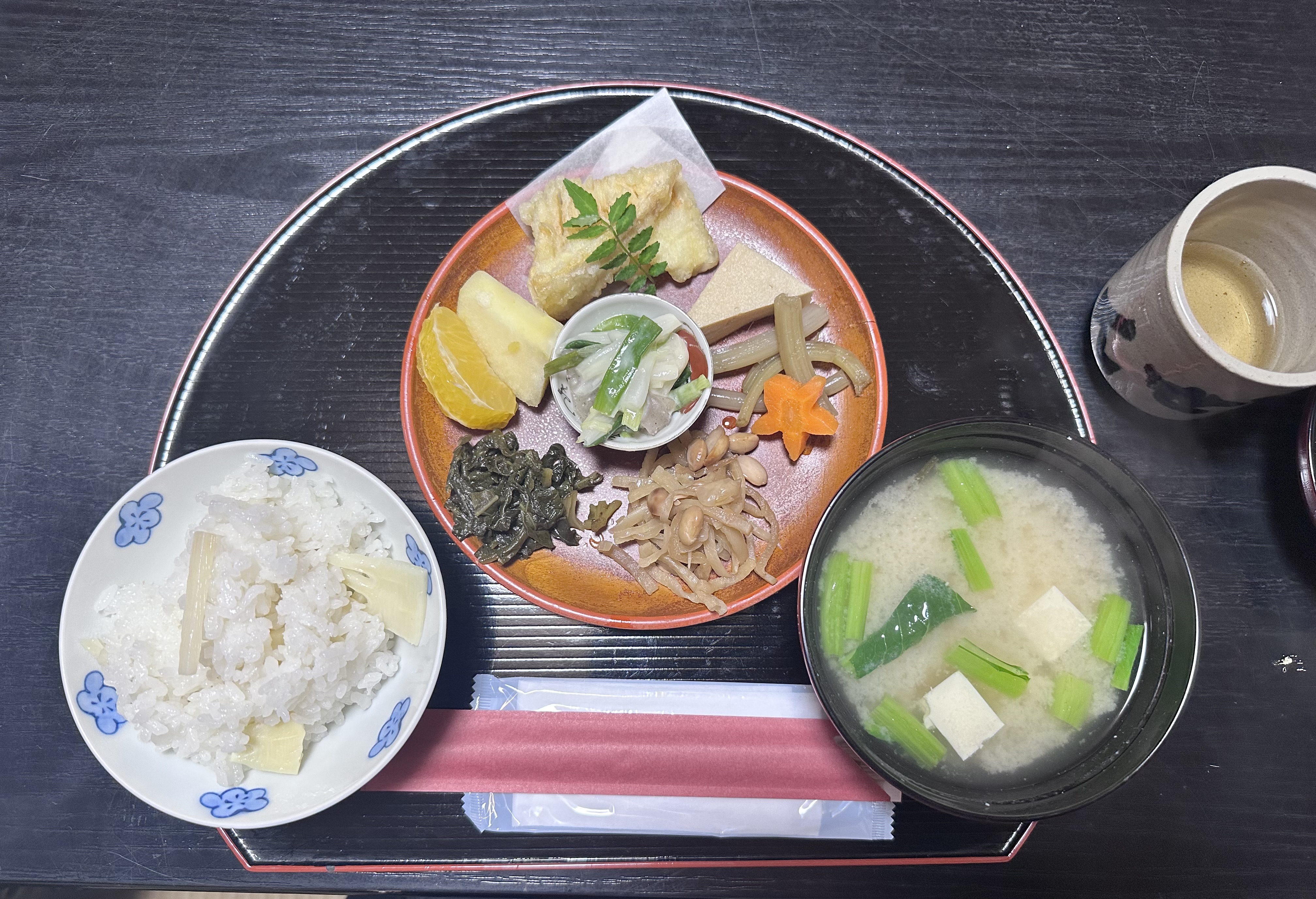 大聖院さまでは、7:00〜7:30副住職様の法要と法話がおこなわれ、その後に続いて精進料理をいただきます(精進料理は前日までの要予約)