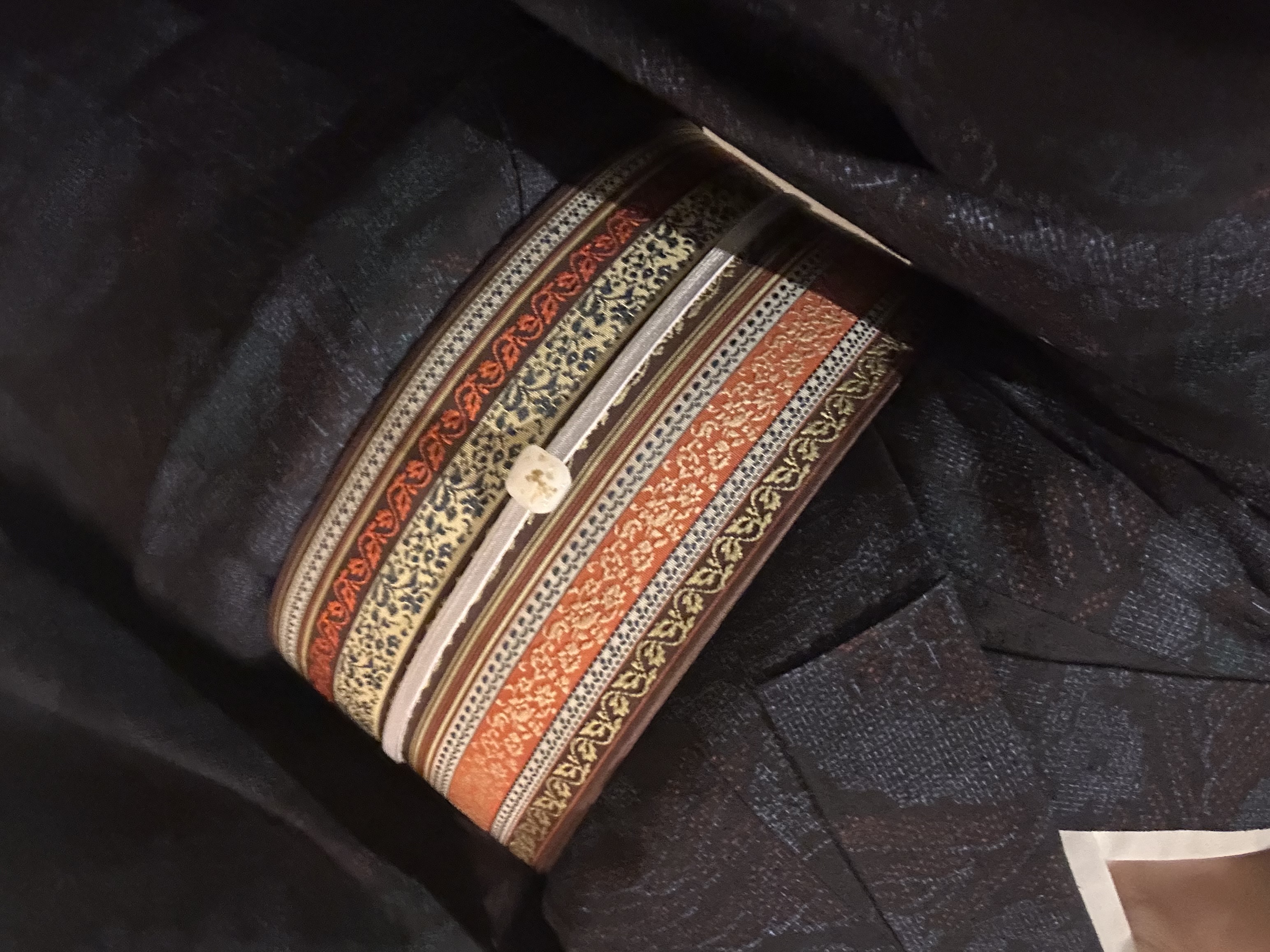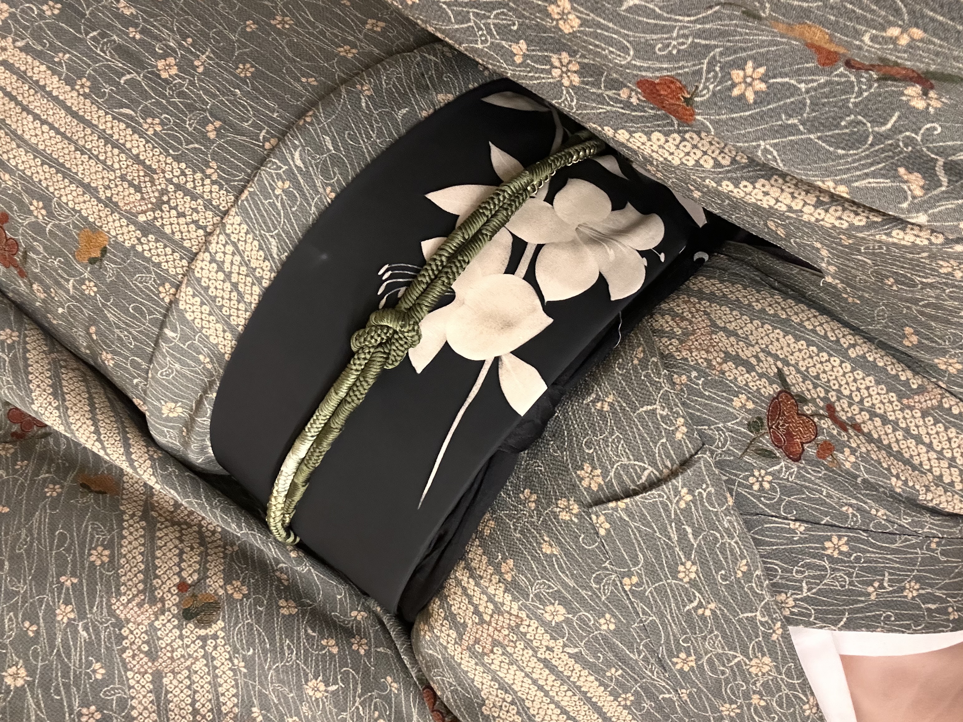黒い帯揚げにも白い花の模様が入ってます。見えてないけど…(喪服用ではないよ)